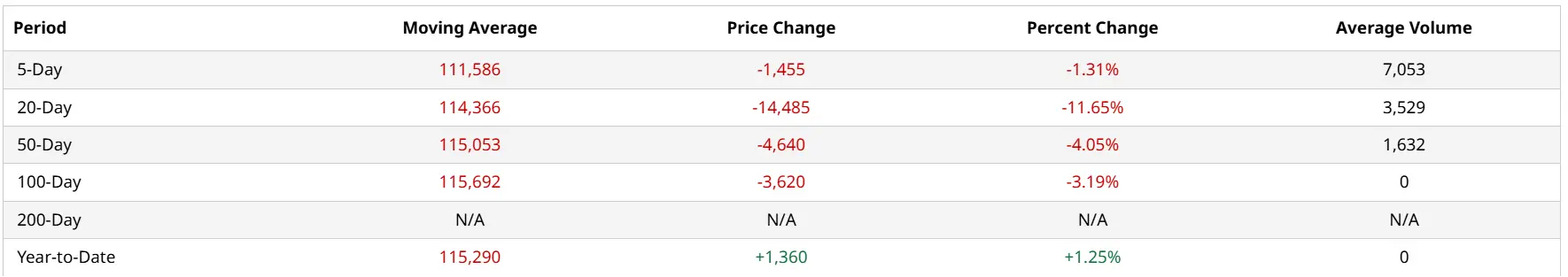 若价格能够重新突破 MA20 附近 $114,366,有望打开短期反弹空间,进一步上攻 MA50 与 MA100 关键均线。