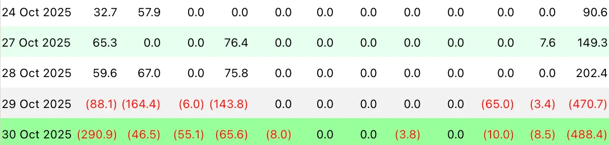 数据显示前两日为净流入,随后两日出现大额净流出,短期资金波动增加。后两日大额净流出则与宏观政策密切相关,鲍威尔在 10/29 表示“12 月降息并非板上钉钉”,削弱了市场降息预期,对风险资产形成短期冲击,促使机构谨慎降低 ETF 敞口。整体来看,ETF 资金流入/流出短期波动幅度较大,但结合链上及交易所资金流向,长期机构仍维持一定持仓,印证市场仍处于“卖压减弱 持币累积”阶段。