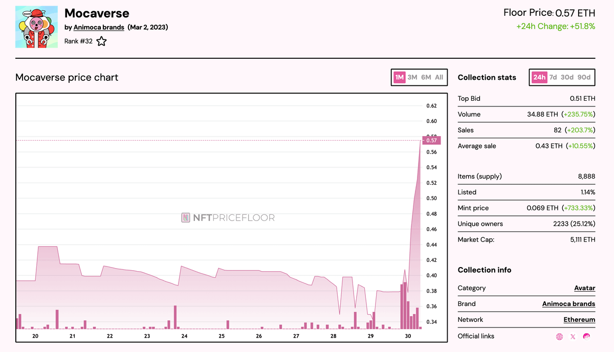 MOCASTR 于 10 月底上线后,迅速成为链上关注焦点。48 小时内,财库多次执行操作,Mocaverse 的 NFT 地板价和成交深度显著提升。与此同时,Animoca 创始人 Yat Siu的社区参与行为,为飞轮提供了强外部信任信号。