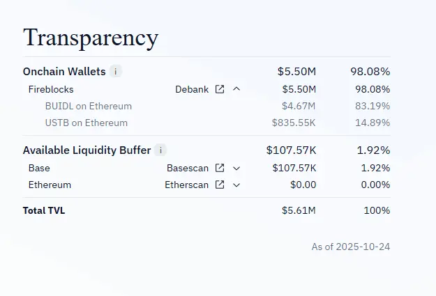 mF-ONE 大部分资产位于链下,声称拥有 1600 万美元的「流动性缓冲」,但这笔资金实际上 100% 存入了 mTBILL。
