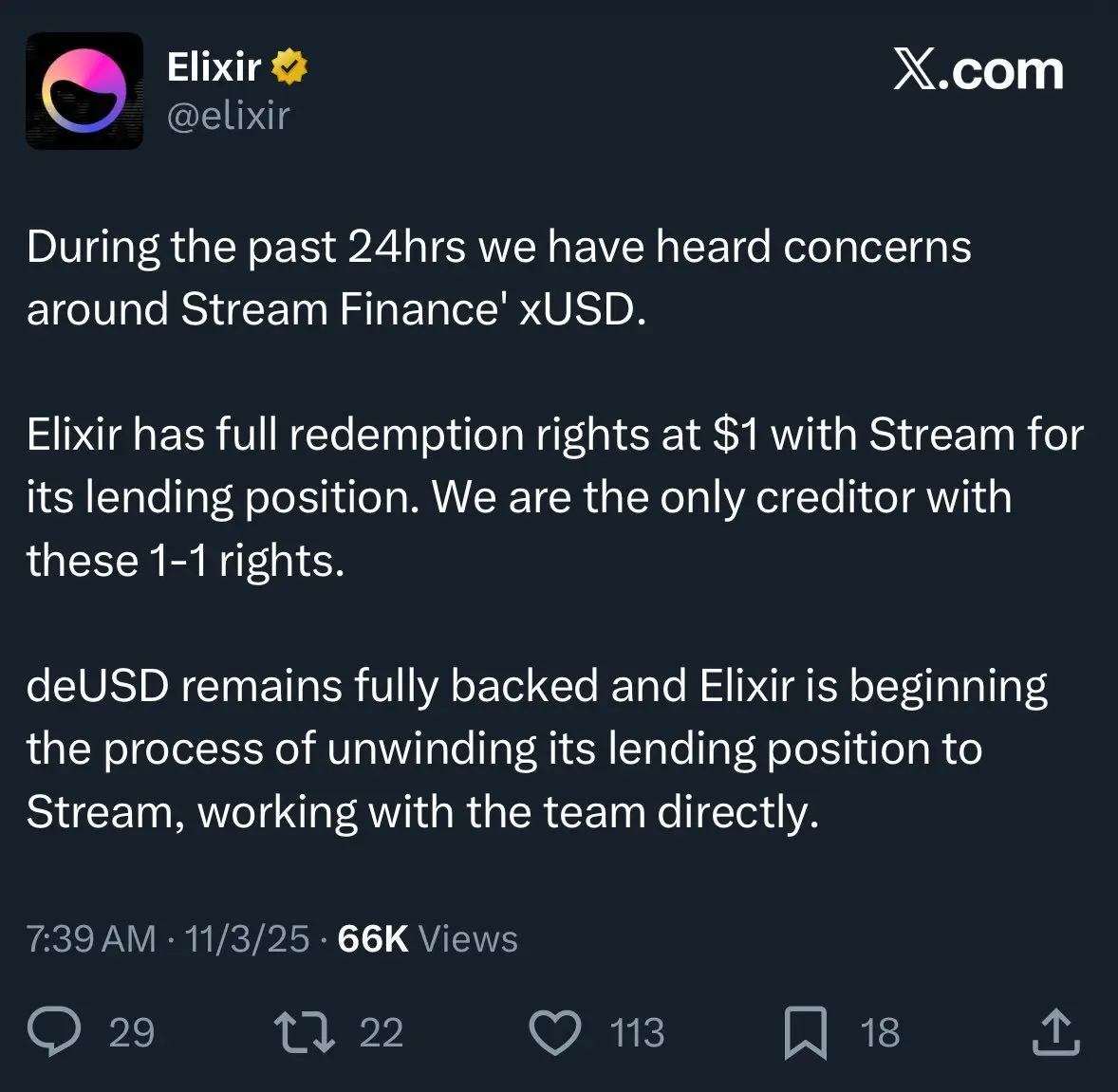但在 Stream 的案例中,问题在于:它不仅做了风险策略,还用另一种稳定币协议 Elixir 进行了「循环借贷」杠杆操作,将风险放大到了极致。