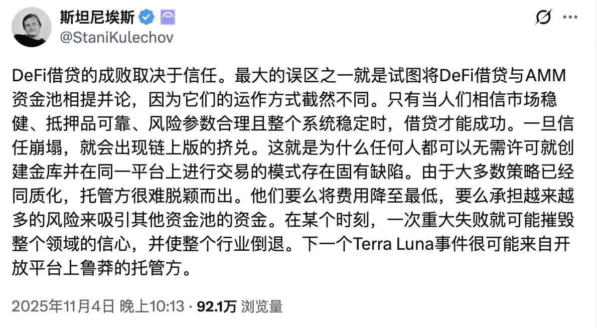 Aave 创始人@StaniKulechov 曾讨论过 DeFi 协议的「策展者」机制,以及何时会出现过度冒险行为: