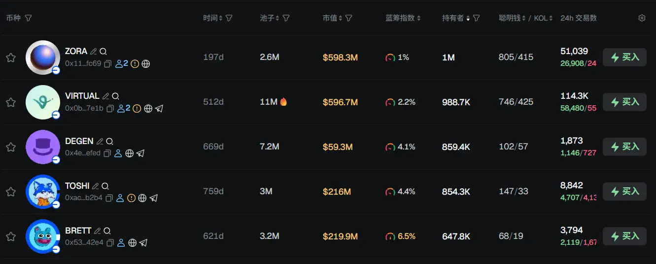 过去 24h Base 热门代币前五依次为:ZORA、VITYUAL、DEGEN、TOSHI、BRETT