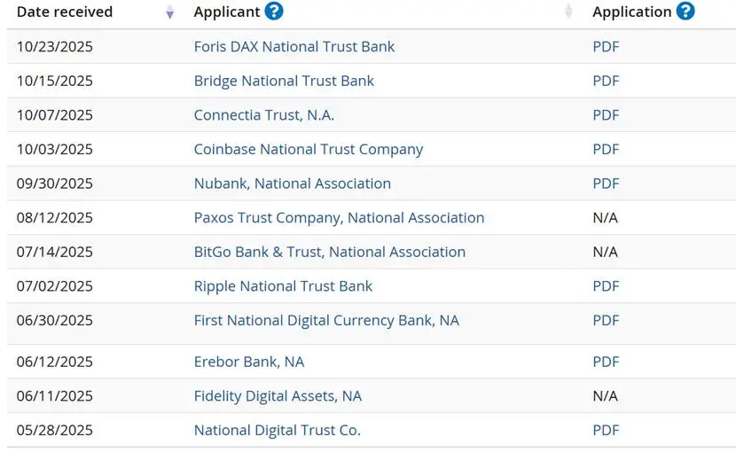 二是美国银行牌照申请,Ripple 于 2025 年 7 月 2 日 向美国货币监理署(OCC)提交设立 Ripple National Trust Bank 的申请,目前处于 120 天法定审查期,最晚将于 2026 年 11 月 2 日 前出初步结果。根据 OCC 官网最新状态,Circle (First National Digital Currency Bank)于 6 月 30 日申请,已超 120 天审查期,仍未获批 ;Paxos 于 8 月 12 日申请,审查中 ;Coinbase 于 10 月 3 日申请,审查中。