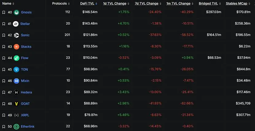 XRPL 公链方面,作为 Ripple 的技术核心,其已服务全球 500 多家金融机构,年化交易量接近 950 亿美元。XRPL 近期升级引入 EVM 兼容侧链,并与 Polygon CDK 合作,提升了智能合约功能。XRPL 的 DeFi 生态相对滞后,DefiLlama 数据显示,XRPL DeFi TVL 仅 7959万美元(排名第49),远不及 Solana 101亿美元和以太坊747亿美元等主流公链。
