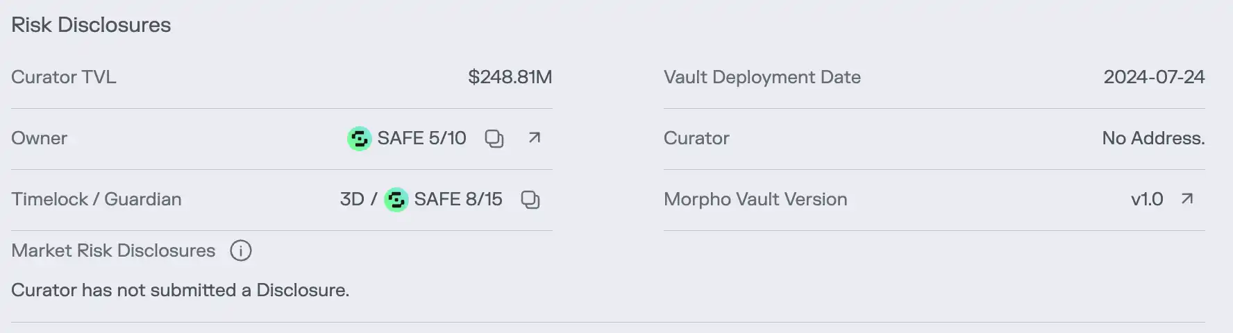 有关金库风险的核心信息,被隐藏在一个不起眼的「Risk」页面中。可即使用户有心点进了该页面,也只能看到金库的具体持仓。杠杆率、风险敞口等决定资产安全的核心信息则无处可寻。
