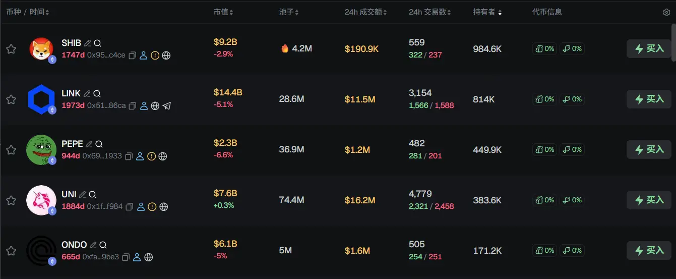 过去 24h ETH 热门代币前五依次为:SHIB、LINK、PEPE、UNI、ONDO