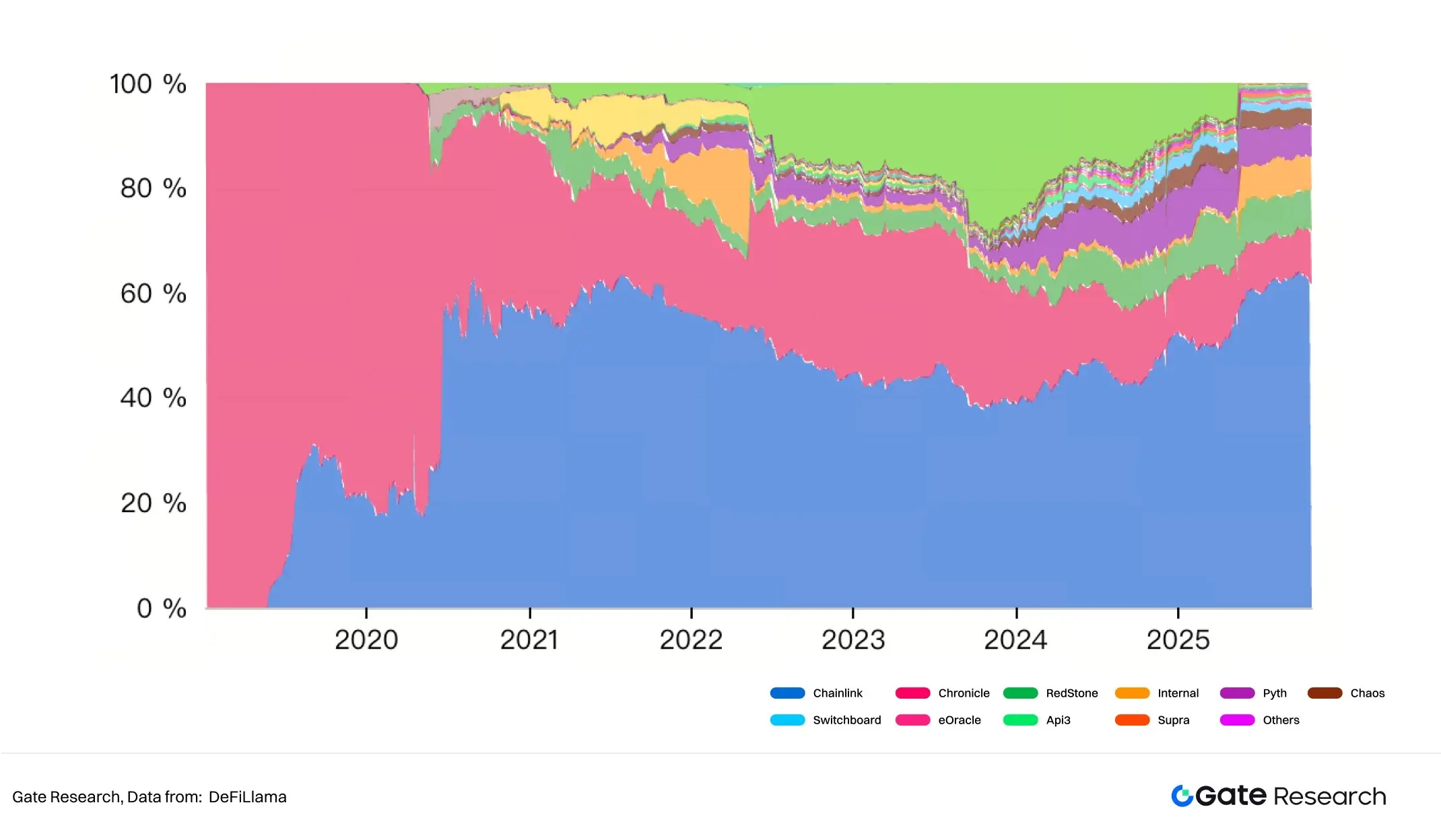 从锁仓规模来看,行业总体担保价值已超过 1,021 亿美元。其中,Chainlink 以 61.58% 的市场份额占据绝对领先地位(TVS 达 629.22 亿美元);其后排名二、三名的为 Chronicle(10.15%) 与 RedStone(7.94%),Pyth Network 以 5.84% 位居第五,API3 以 0.55% 排名第九。总体上,尽管 Chainlink 仍主导市场,但新兴协议的渗透速度正明显加快,行业结构正由单极化向多极化演进。