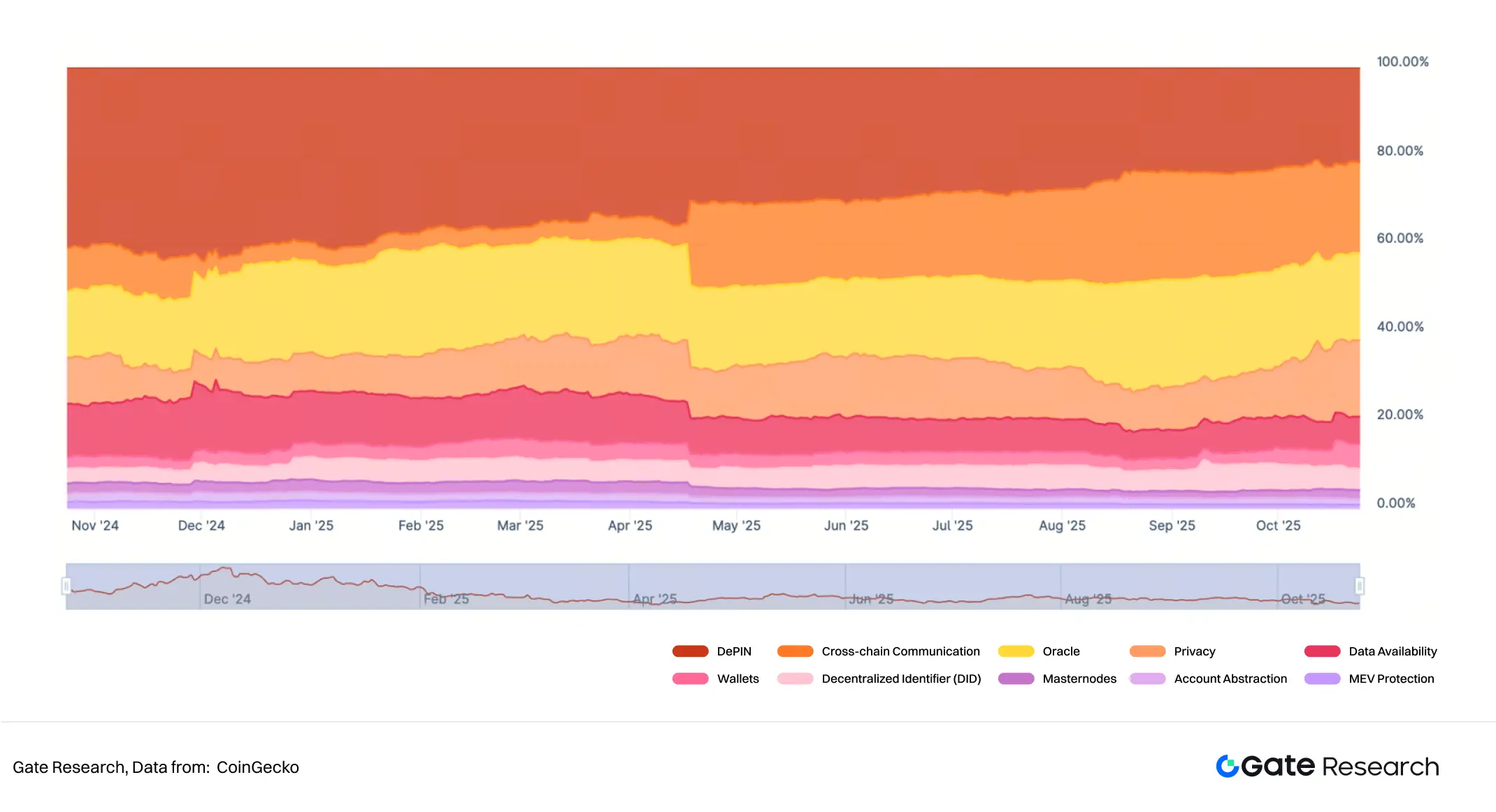 截至 2025 年 10 月,根据 DefiLlama Total Value Secured (TVS) 与 CoinGecko 市值数据,预言机协议的整体锁仓规模约为 1,021.79 亿美元,整体市值约 141 亿美元,较 2024 年同期(约 98 亿美元)增长超过 43%。在区块链基础设施赛道中,预言机板块市值占比已接近 20%,成为增速最快的细分领域之一。