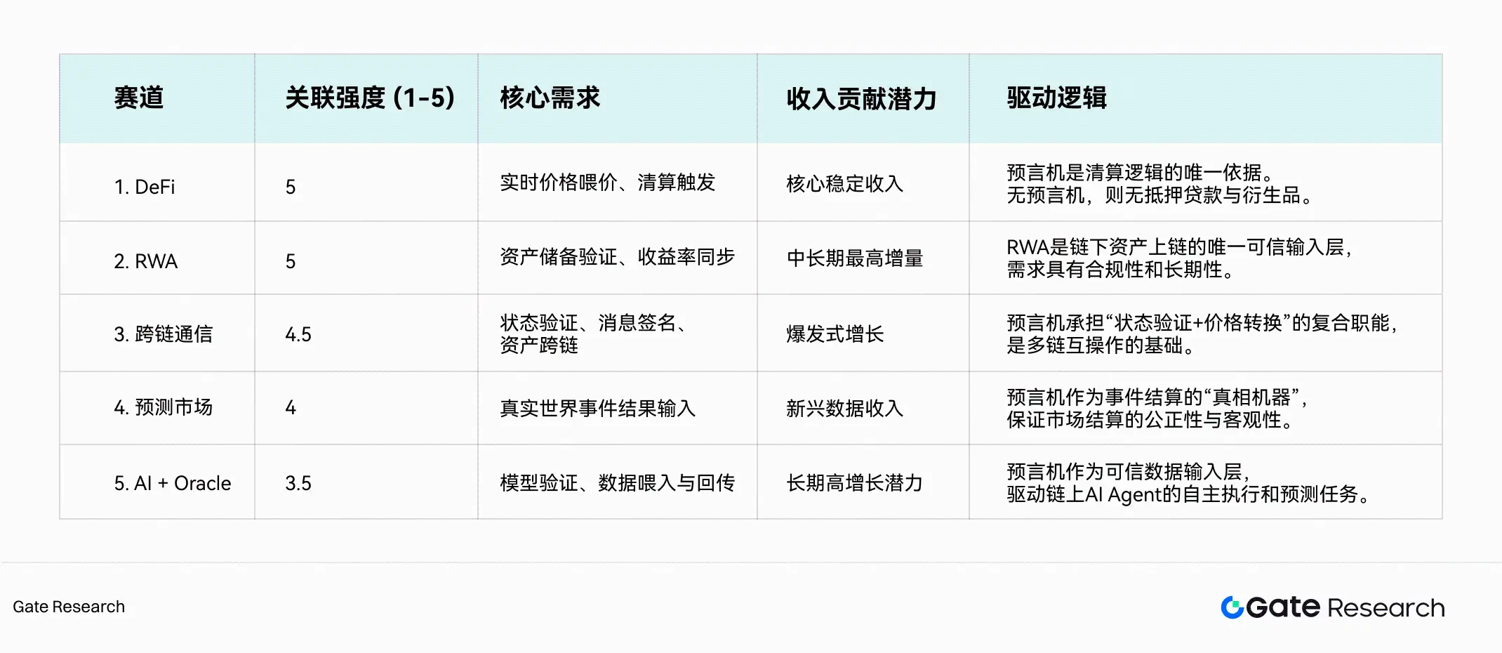 基于前述三大驱动因素,并结合当前预言机的调用量、收入贡献潜力与战略协同度,本报告将预言机生态的主要服务对象划分为五大核心赛道:DeFi、RWA、跨链通信、预测市场及 AI Oracle。其中,DeFi 是预言机的原生主战场,RWA 是机构化增长引擎,而跨链通信、预测市场与 AI Oracle 则构成新兴增长曲线。