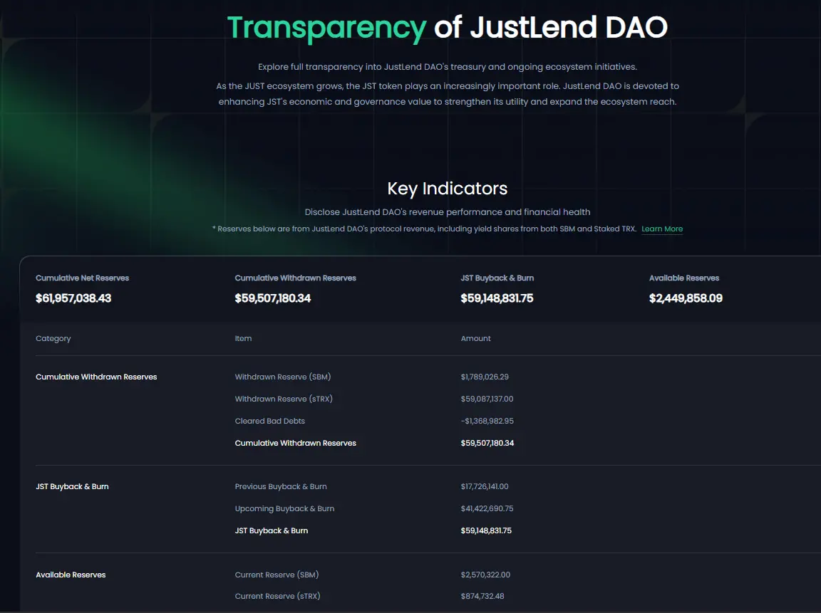 在平台收入方面,财务透明度升级。JustLend DAO 于 11月1日在官网正式上线 “财务透明度运营指标(Transparency)”,全面披露核心财务维度 —— 包括累计净收益(主要涵盖 SBM 借贷市场与 Staked TRX 收益)、已提取净收益、剩余净收益及 JST 回购销毁进程等。