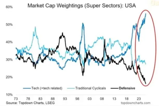所以科技股持续膨胀,而防御板块落后。