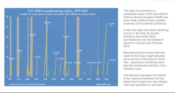 制造业 PMI 指数已连续萎缩超过 18 个月,是二战以来最长纪录,但股市却持续上涨,因为利润越来越集中在科技巨头和金融公司。(注:「制造业 PMI 指数」的全称是「制造业采购经理人指数」,是衡量制造业健康状况的「晴雨表」。)
