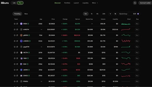 Kuru 是一个基于 CLOB 的交易所,可快速买卖代币。它还允许用户发行自己的代币,因此非常适合「启动板」类别。