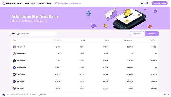 Monday Trade 是一个基于 Monad 的混合现货去中心化交易所(DEX),它在一个平台上结合了自动做市商(AMM)流动性和链上订单簿。这种混合模式,加上其高燃气效率,使 Monday 成为执行顺畅交易而不会产生高滑点的理想平台。