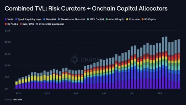 OCCA 通常推出具有品牌标识的策略产品,而风险管理人则更多利用模块化货币市场(如 Morpho 和 Euler),通过参数化金库来提供收益。这两类产品的总锁仓价值从 2023 年的不到 200 万美元,激增至 200 亿美元,增长约一万倍。