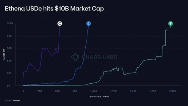 过去仅属于交易部门和机构的收益产品,如今已走入主流。USDe 成为最快达到 100 亿美元总锁仓价值的稳定币。