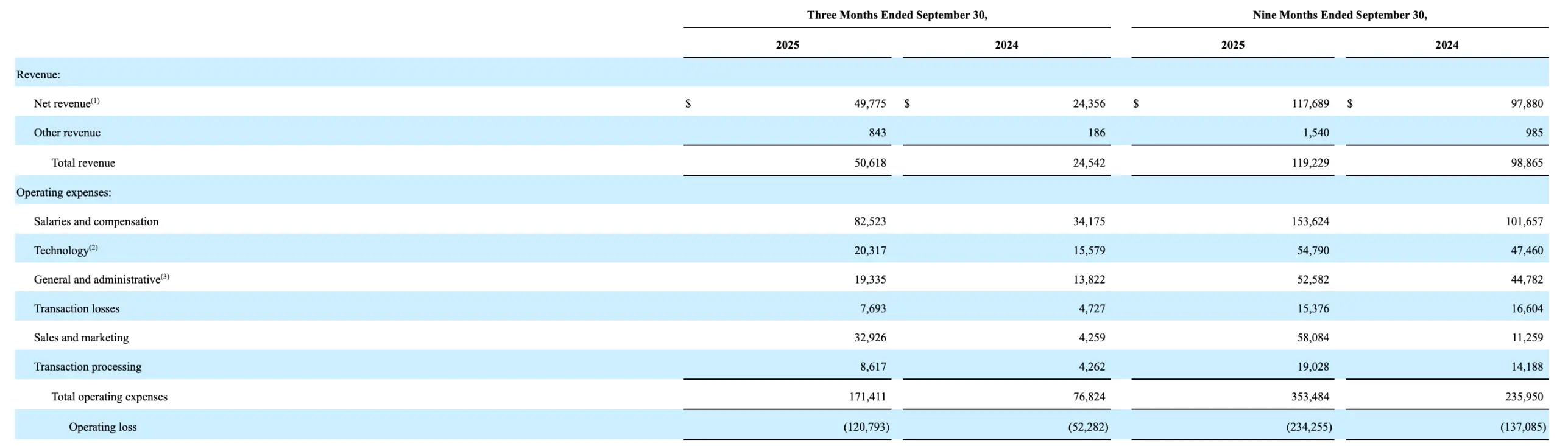 收入增长的同时,Gemini 的运营成本也以更高的比例上升。三季度 Gemini 运营支出达到 1.71 亿美元,同比提高了 123.1%,销售和市场费用更是同比上升了接近 7 倍。
