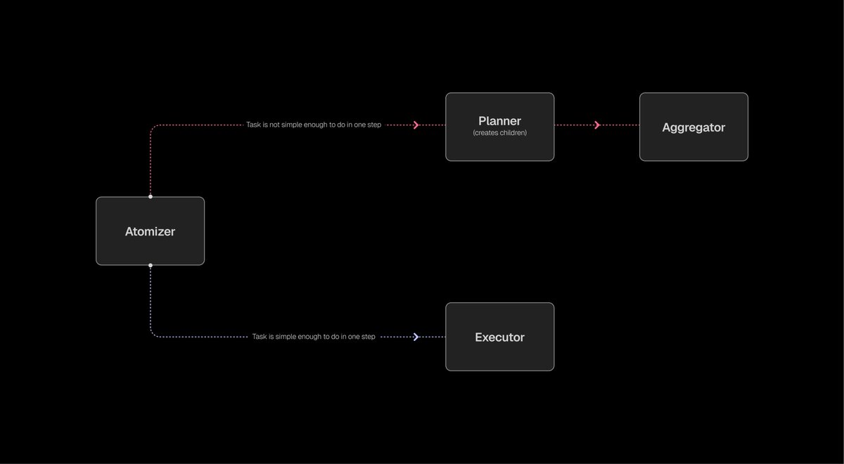 当某个子任务足够简单时,节点转为执行器,调用相应工具或模型(如搜索 API、信息抽取模型),再将输出传递给后续节点。