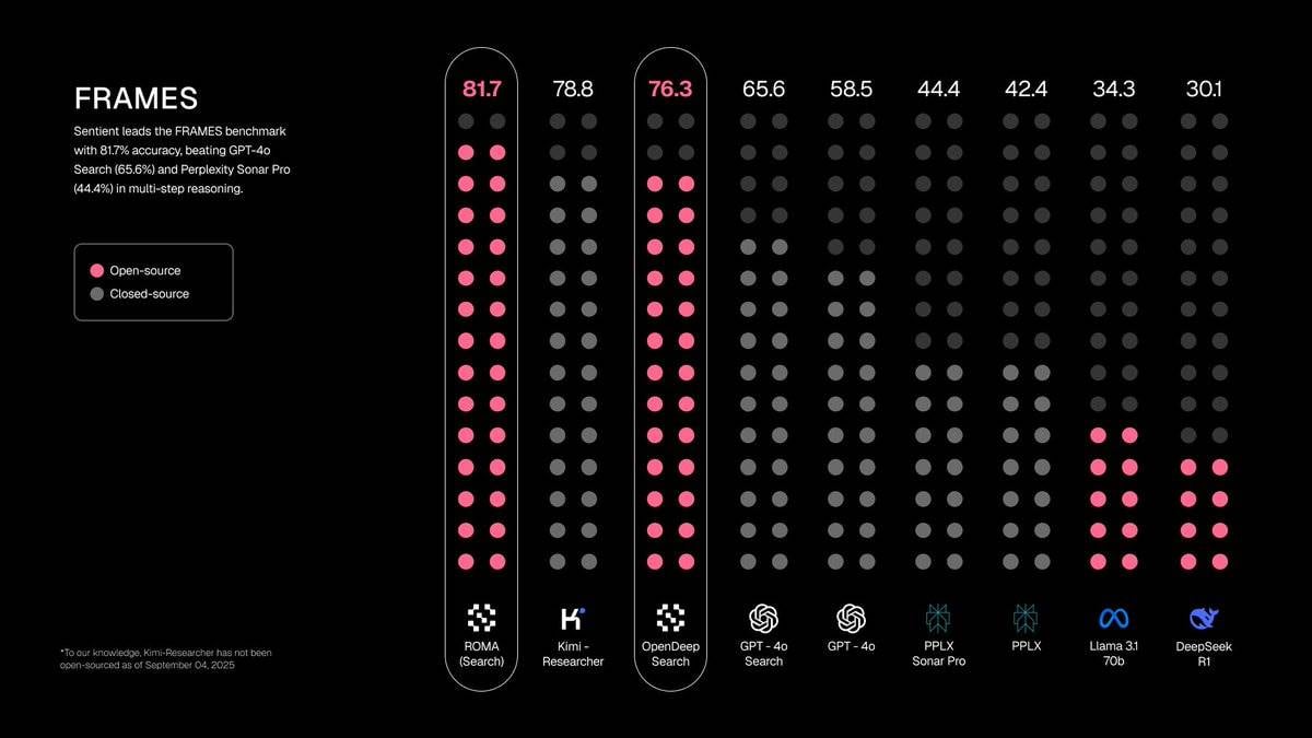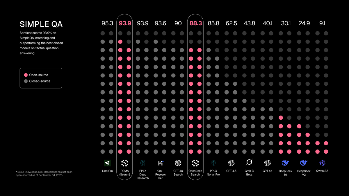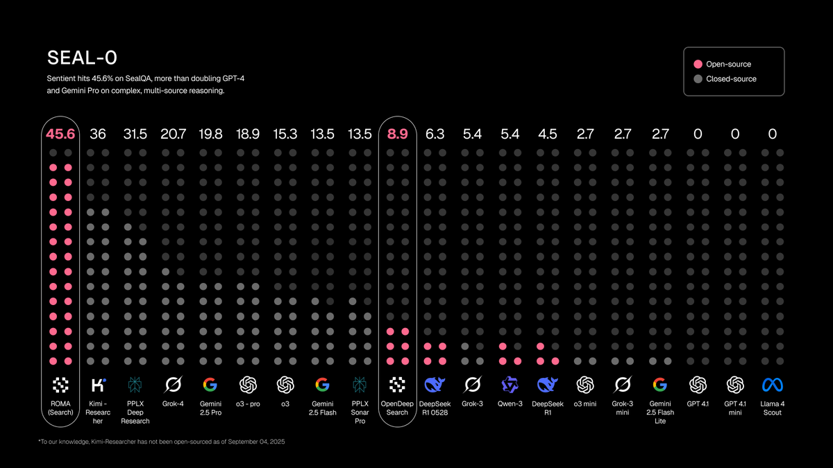 在开源模型中,ROMA Search 大幅超越由 Sentient 自研的 Open Deep Search(8.9%)。