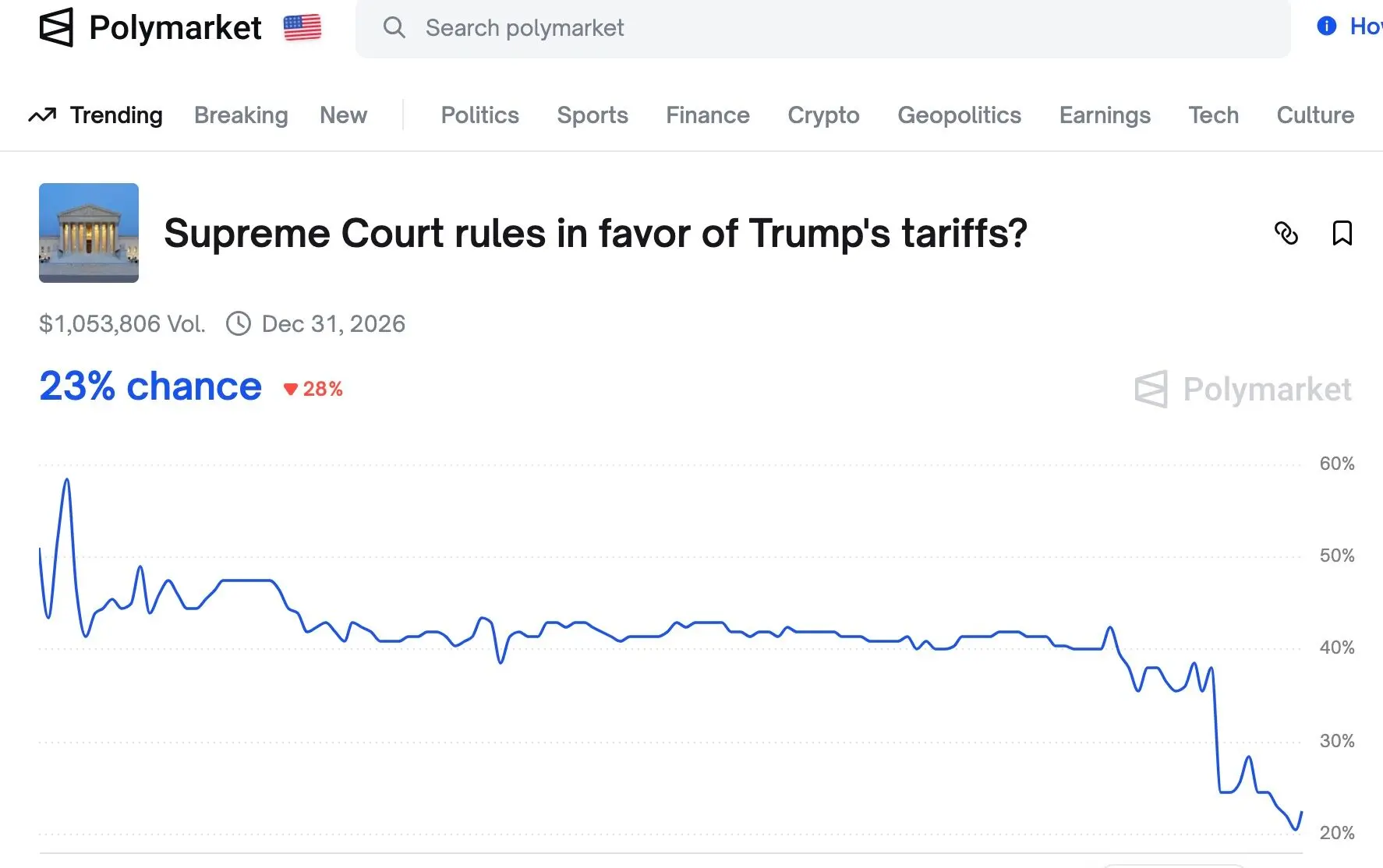 在狂热情绪背后,一场法律角力正在进行。美国最高法院目前正在审理关税合法性的案件。截止 11 月 10 日发稿前,根据去中心化预测市场 Polymarket 的数据,交易者给出最高法院批准的概率仅 23%;在预测平台 Kalshi 上,这一数字更低,仅 22%。换言之,市场多数押注该计划最终将遭司法否决。