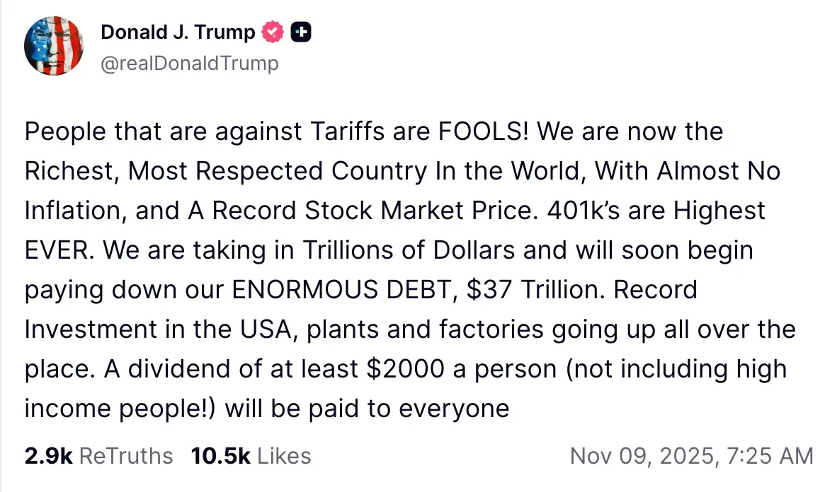 11 月 9 日,他在 Truth Social 上正式宣布计划:「我们正在收取数万亿美元,并很快开始偿还我们巨大的债务。每个人(不包括高收入人群!)将获得至少 2000 美元的红利。」