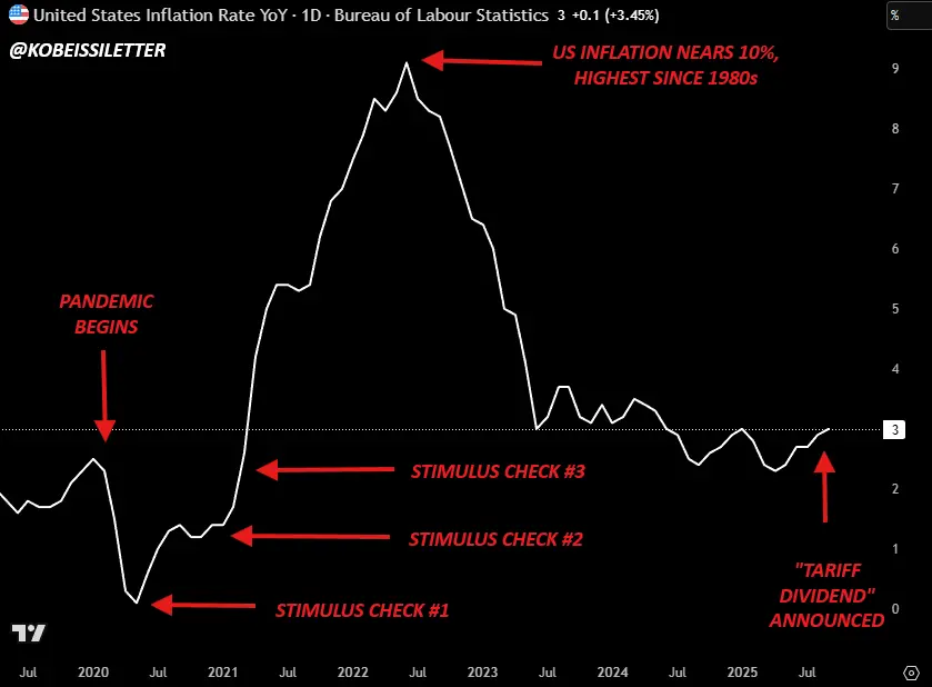 而根据 Kobeissi Letter 的投资分析师的测算,参照过往疫情期间刺激支票的分配模式,目前约有 2.2 亿美国成年人符合领取该刺激支票的领取资格。在形式上,这听起来像一次「财政创新」;在实质上,它是一次政治剧本的重演。先喊口号,刺激市场反映。