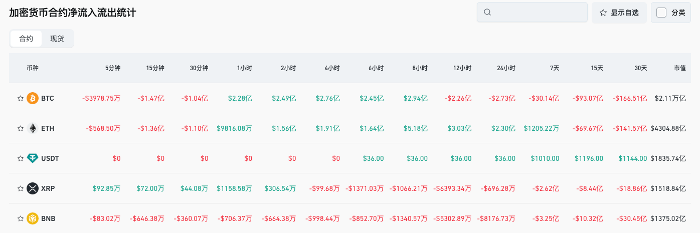 5、过往24小时内,BTC ETH USDT XRP BNB等币种合约交易净流出领先,或存在交易机会;