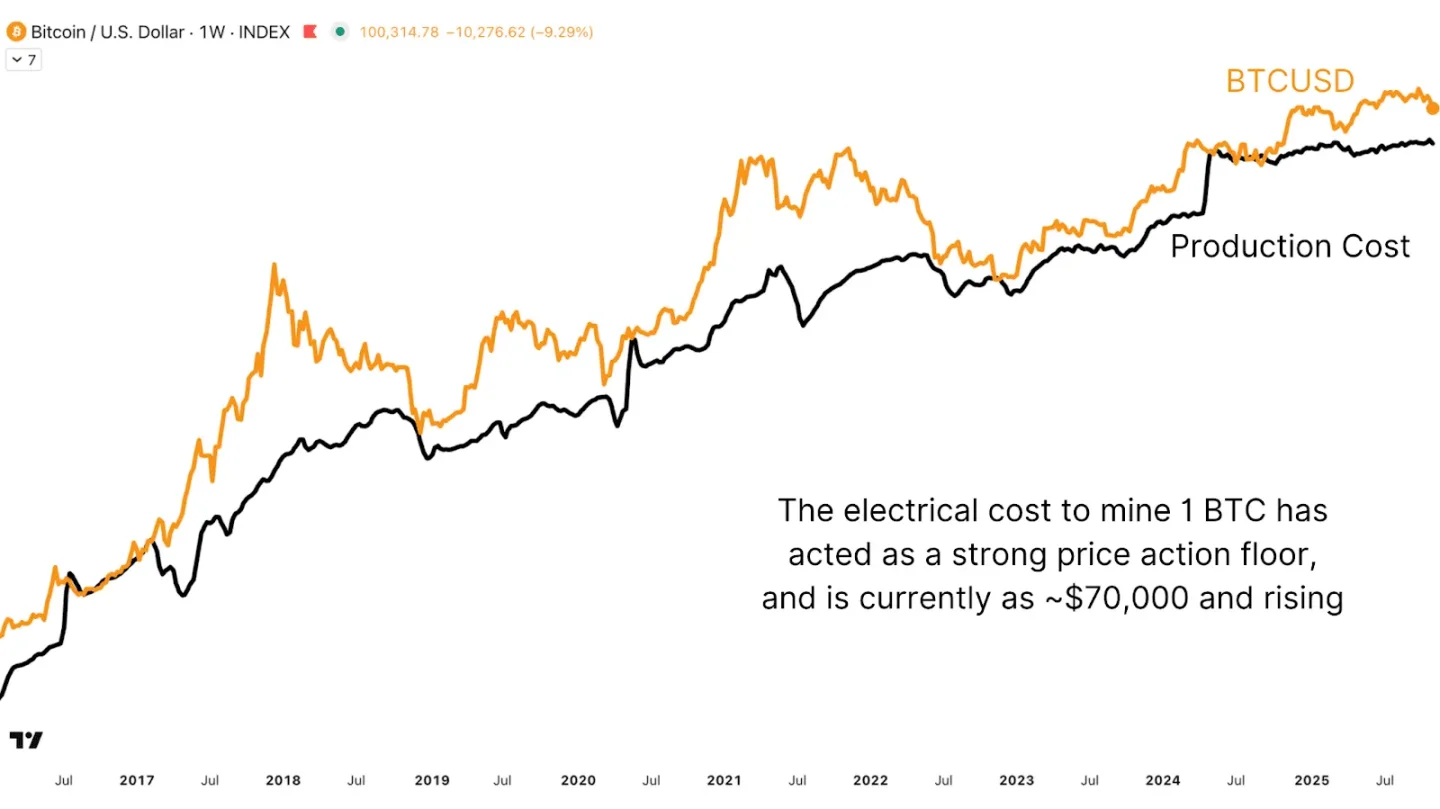 比特币生产成本(单币挖矿电力成本)是长期价值的重要锚点,历来与熊市底部高度吻合。每次减半后成本翻倍,形成持续上移的价格底线。