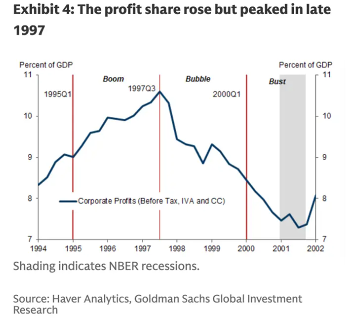 在互联网泡沫破灭前,公司的负债日益增加。高盛的分析显示,企业债务占利润的百分比在2001年达到顶峰,恰好是泡沫破裂之时。