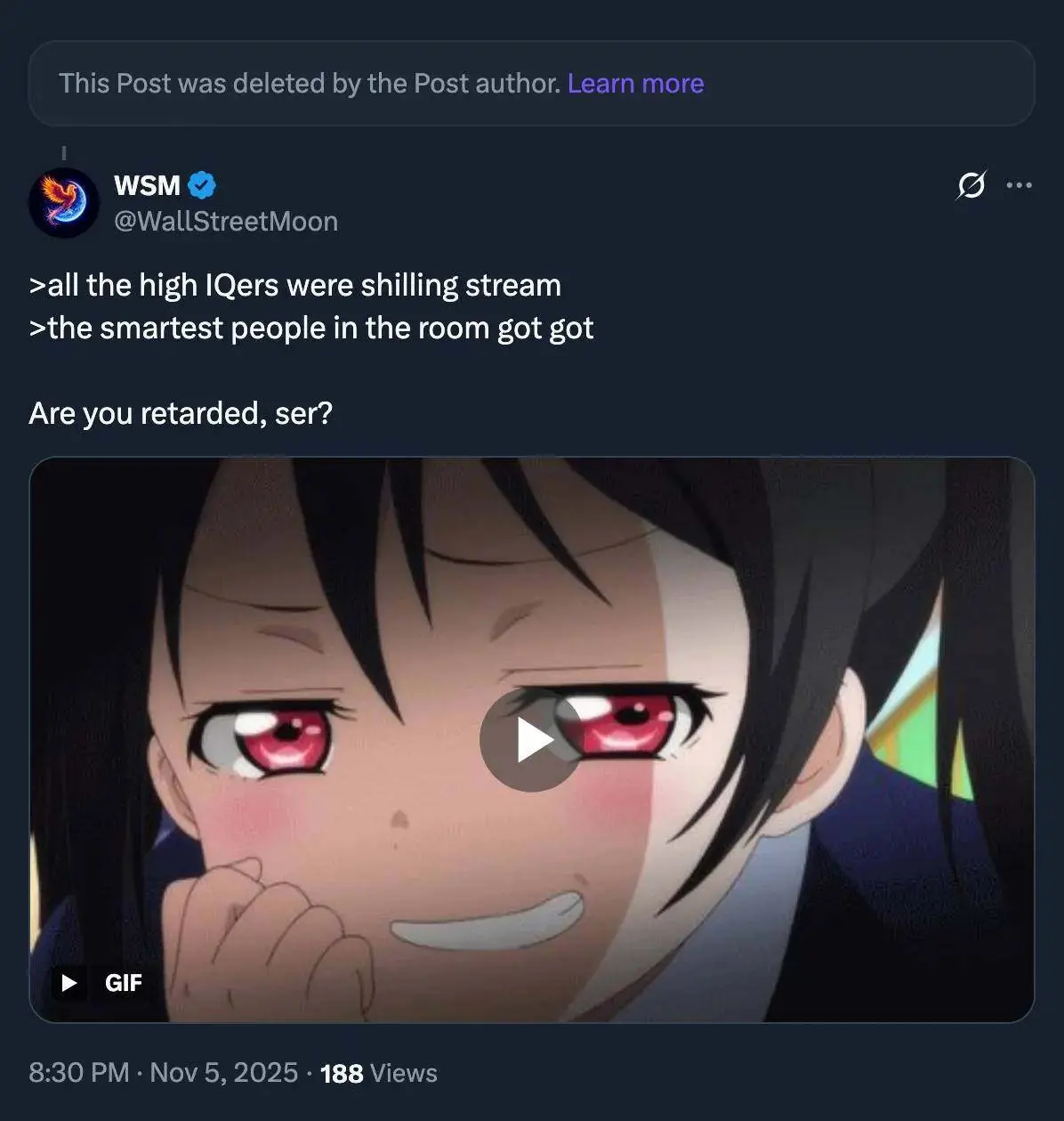 @AzFlin[已删除帖子]做了一篇关于所有在 StreamFinance 上被“收割”的“聪明人”的复盘。这对我来说简直像个笑话: