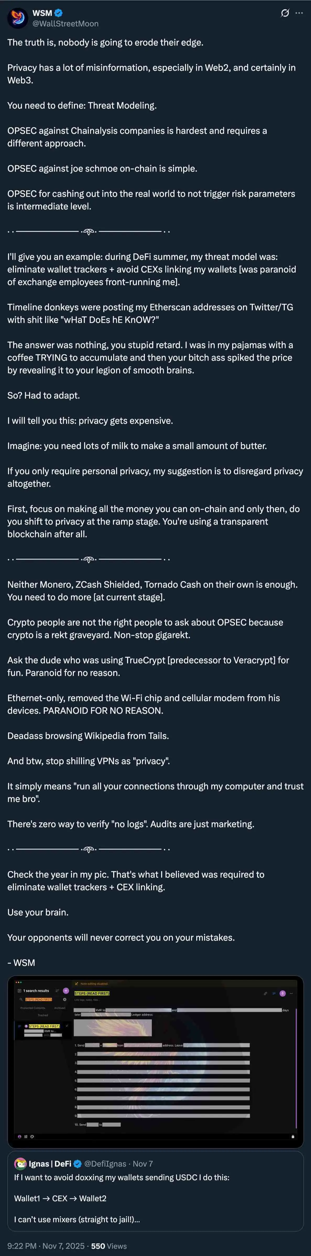 是的,我必须避开钱包追踪器以及中心化交易所(CEX)和去中心化交易所(DEX)之间的关联。我一直是金融隐私的坚定支持者,尤其是对门罗币(Monero),这些年来我通过捐赠一直支持它。