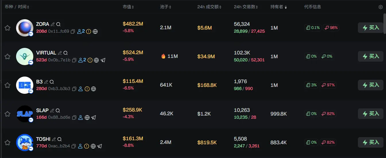 过去 24h Base 热门代币前五依次为:ZORA、VIRTUAL、B3、SLAP、TOSHI
