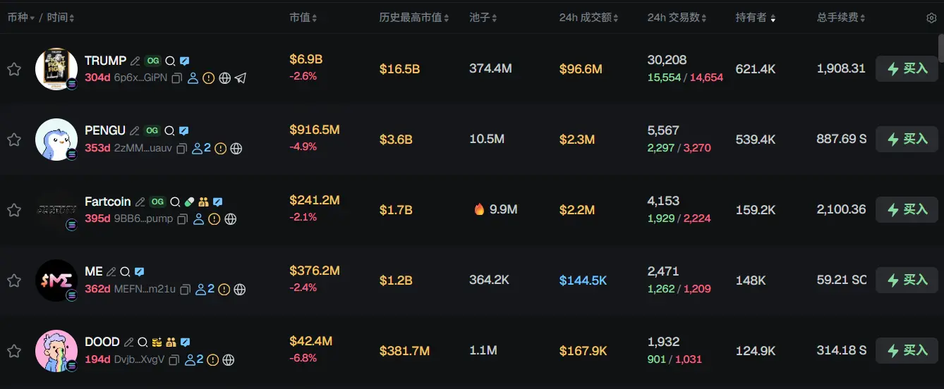 过去 24h Solana 热门代币前五依次为:TRUMP、PENGU、Fartcoin、ME、DOOD