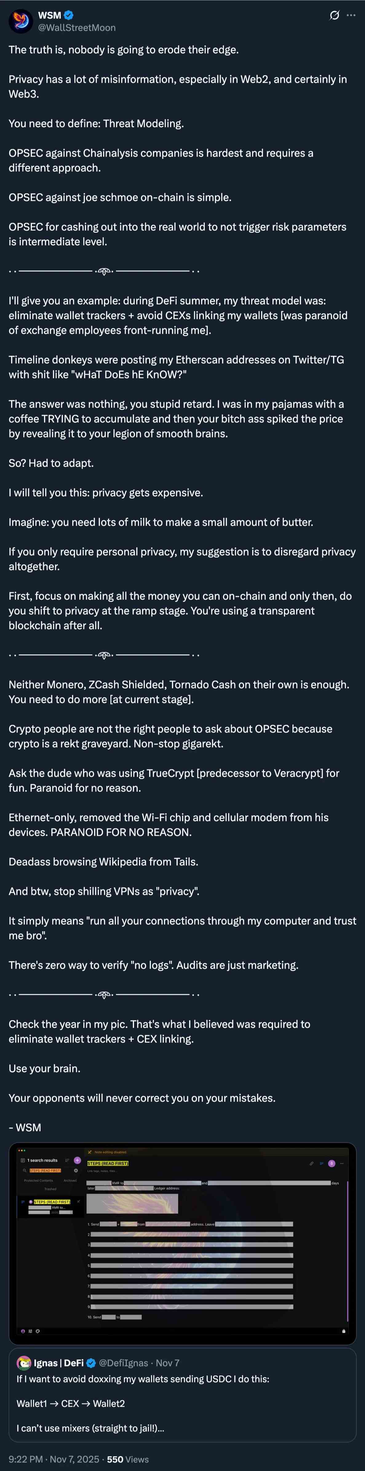 是的,我必须避开钱包追踪器以及中心化交易所(CEX)和去中心化交易所(DEX)之间的关联。我一直是金融隐私的坚定支持者,尤其是对门罗币(Monero),这些年来我通过捐赠一直支持它。