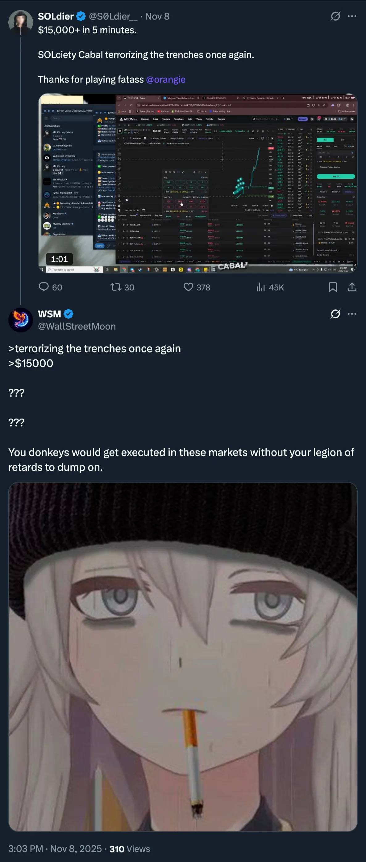当那些实际操作“拉盘砸盘”(pump and dump)的团体,或者像加密推特(CT)喜欢称呼的“秘密联盟”(cabals),开始积累我早已持有“神级仓位”(God position)的项目代币时,这场景真是颇具喜剧性。他们最终成了我的退出流动性(exit liquidity)。你无法惩罚一个早期进入者,因为他们的买入价格远远低于你的成本价。