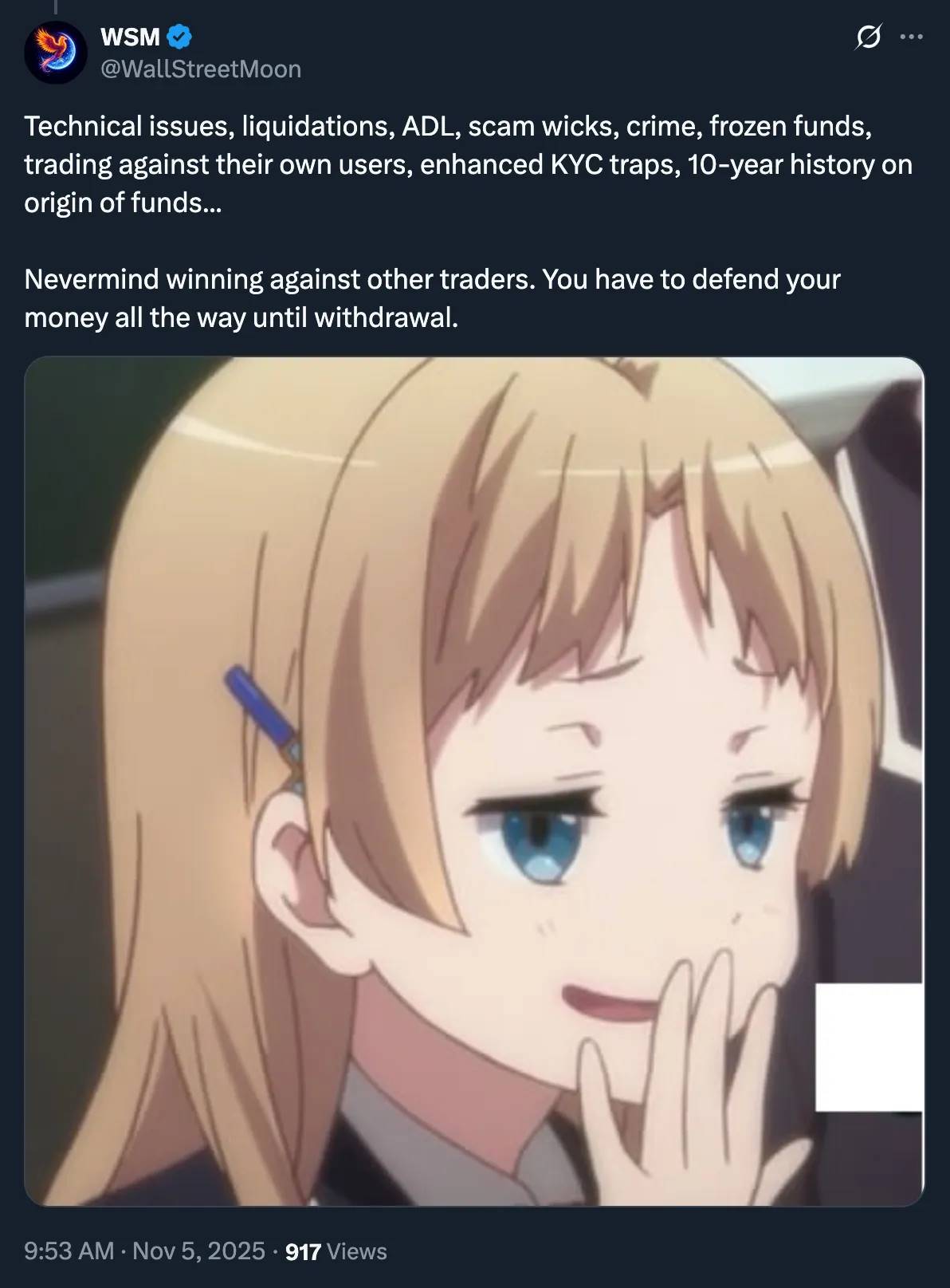 中间商们却“坐拥舒适”,带着幸灾乐祸的心态看着交易者在斗兽场中互相厮杀。他们承担零风险,却收割所有收益,看着你被“爆仓”。更甚的是,他们还提供推荐链接,把更多受害者引向“爆仓墓地™”,为自己创造无限利润。几乎所有交易所创始人都成为了亿万富翁,这可不是没有原因的。