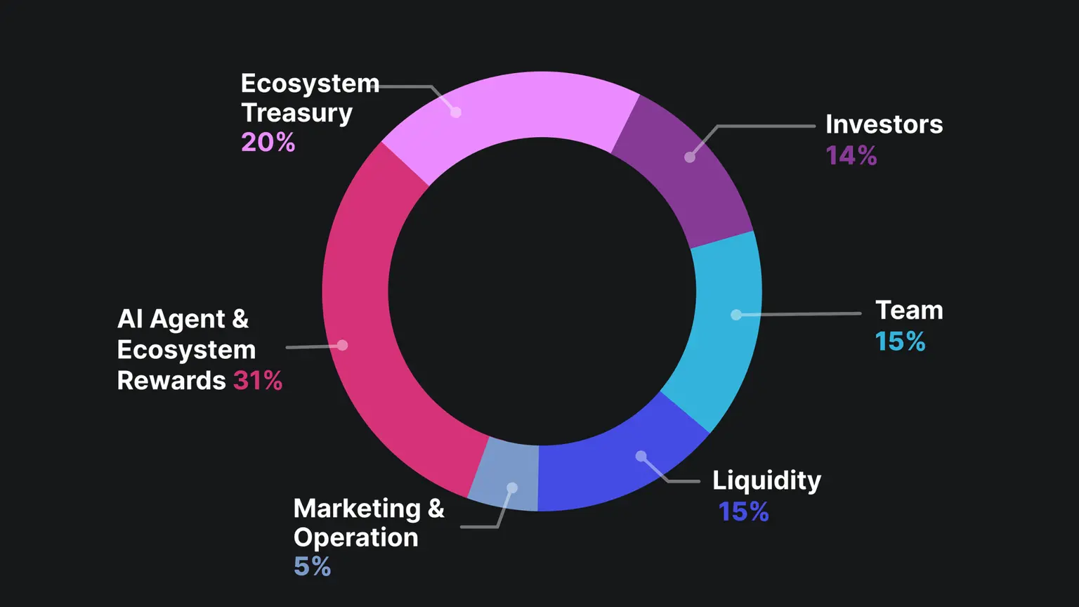 生态及社区 (71%):其中 31%分配给AI代理及生态奖励,用于日常用户激励(如聊天挖矿、策略奖励等);15%用作流动性,已在代币上线时全部释放以支持交易对流动性;20%作为生态金库储备,用于未来生态拓展和战略机会;5%用于市场营销和运营支出,包括合作推广、活动奖励等。