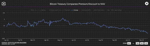 数字资产信托(DAT)公司为机构投资者提供了另一种获取比特币敞口的方式。Strategy(股票代码:MSTR US)是持有比特币的最大 DAT。当其股价相对于其持有的比特币出现大幅溢价时(称为 mNAV),该公司可以发行股票和其他融资方式以低廉的价格获取比特币。随着溢价(Premium)下降为折价,Strategy 获得比特币的速度也随之减慢。