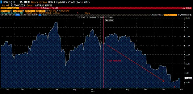 我最初对停摆后的风险资产持乐观态度。然而,当我深入研究数据时,我注意到自 7 月以来,根据我的指数,大约有 1 万亿美元的美元流动性蒸发了。增加 1500 亿美元是很棒,但接下来呢?