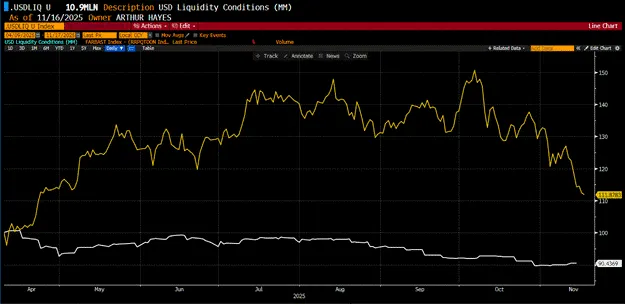 然而,最近,比特币隐含的美元流动性预报恶化了。自 10 月初创下历史新高以来,比特币已下跌 25%,许多山寨币受到的打击比资本家在纽约市市长选举中受到的打击还要严重。