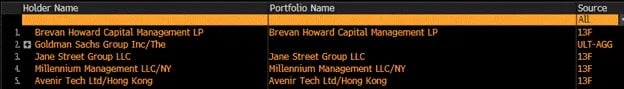 这些是 IBIT US 的五个最大持有者。他们是大型对冲基金或专注于自营交易的投资银行,例如高盛。