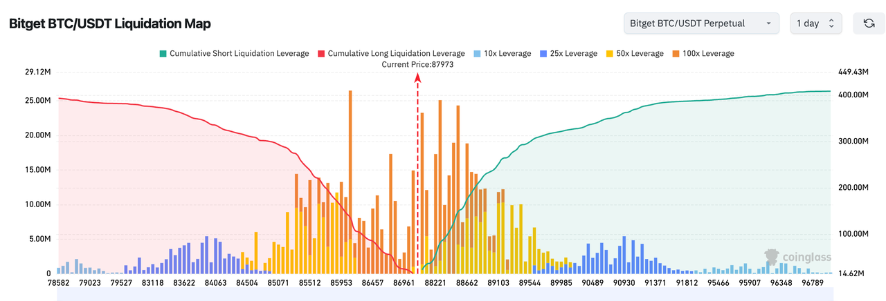 3、Bitget BTC/USDT清算地图显示:当前价 87,973 正处于“多头绞肉机”核心区,上方 88,200–91,000 堆积巨量 50x–100x 多单,突破 91k 将引爆多头清算瀑布直冲 95k ;下方空头清算墙极薄,跌破 86k 几乎无强支撑,市场极度一面倒看多,假突破猎杀风险高。