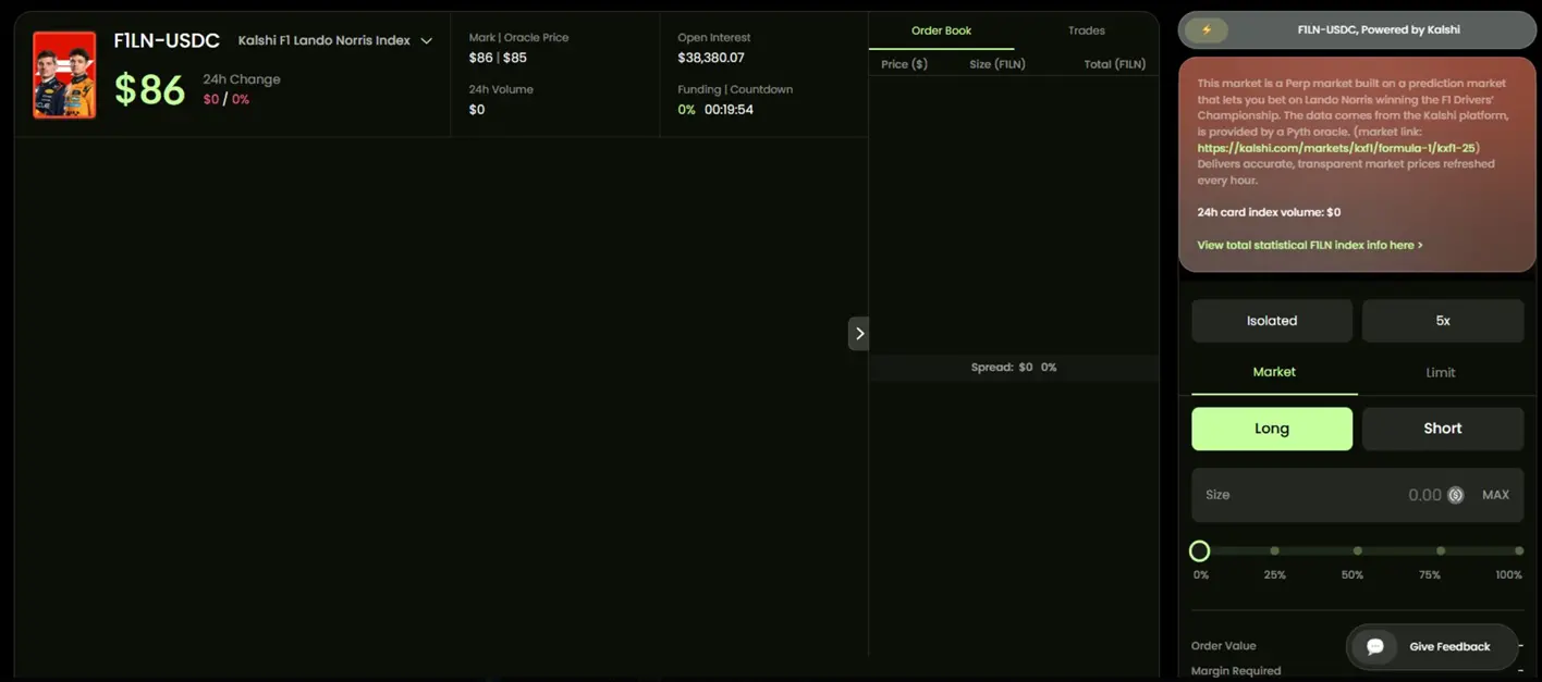 另外一个非常有意思的点是 TROVE 和预测市场 Kalshi 达成了合作关系。比如下图中的 F1LN 合约,实际是对 F1 车手 Lando Norris 能否夺冠进行多空交易,数据来源于 Kalshi。这种合作实际上打通了预测市场与 Perp DEX 间的套利。