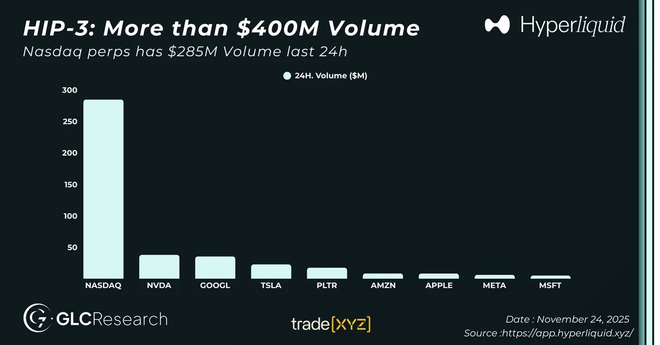 trade.xyz 由 Hyperunit 团队构建。在 HIP-3 升级完成后,trade.xyz(Hyperunit) 购入了首个 Ticker「XYZ100」。根据 @GLC_Research 的数据,在昨日,HIP-3 市场 trade.xyz 的交易额首次突破 4 亿美元大关。尤其是 trade.xyz 的「链上纳斯达克指数合约」$XYZ100 在昨日的交易额达到了 2.85 亿美元。