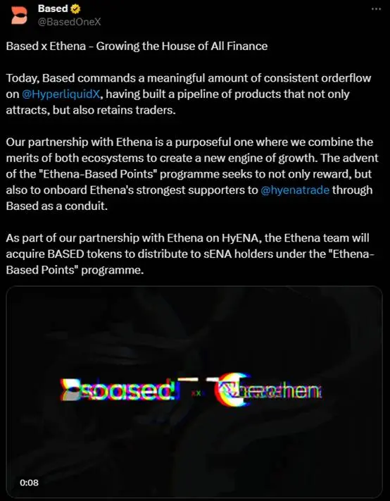Based 表示将结合 Hyperliquid 与 Ethena 两个生态的优势结合,打造出一款全新产品也就是 Hyena。市场推测,这可能是一个允许用户使用 USDe 抵押品进行交易,并在交易过程中赚取 sUSDe 收益的平台。