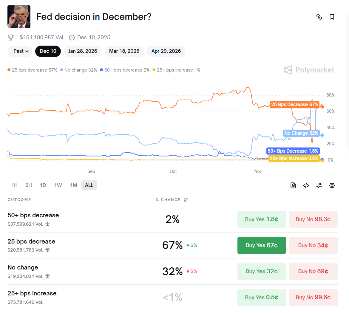 这场分歧的深度从市场预期的剧烈波动中可见一斑:短短几周内,12 月降息的概率从高点 95% 暴跌至 30% 以下,又在威廉姆斯发言后迅速回升至 60% 以上。这种过山车式的预期变化背后,是美联储内部难以弥合的政策理念冲突。