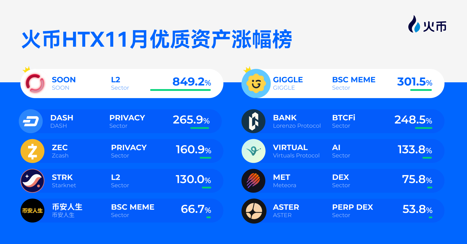 火币 HTX 发布「火币严选」11月资产涨幅榜:SOON 暴涨 849.2%,六大赛道优质项目覆盖市场 Alpha