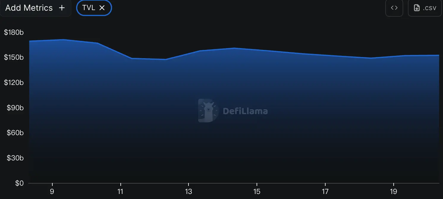 据DeFiLlama的数据,本周DeFi总TVL为1,144亿美元,较上周1,224亿美元,下降约6.54%。