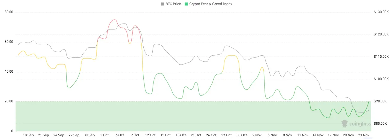 加密货币恐慌指数为20,显示为极度恐慌。